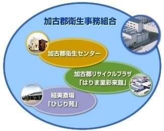 加古郡衛生センターでは、し尿・浄化槽汚泥を適正処理し、高度処理したきれいな水を放流します。処理工程で発生する汚泥は脱水後、肥料にリサイクルする業者に渡しています。加古郡リサイクルプラザでは、不燃ごみ、粗大ごみ、PETボトルを適正処理し、再資源化を行っています。(不燃ごみ、粗大ごみは、ごみ処理の広域化に伴い令和4年3月からは処理を中止し、中継施設として使用しています。)加古郡ストックヤードでは、プラスチック容器類ごみを事業者によって固形燃料化し、製紙工場に渡しています。製紙工場では、コークスや石炭の代替燃料として有効利用されています。はりま里彩来館では、牛乳パックを使った紙すきや食用廃油を使った石けん作りなどの廃棄物を利用した体験教室やフリーマーケットを開催し「ものを大切にし、ものを生かす心を養う事」で、リサイクルに感心をもつきっかけとなり、リサイクルの意義と楽しさを住民に広く知って頂くよう心掛けています。稲美斎場ひじり苑では、火葬業務を行っており、人生終焉の場として相応しい運営を心掛けています。