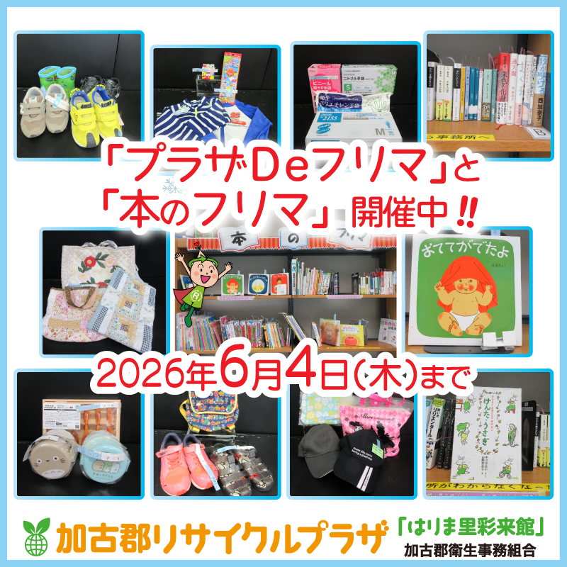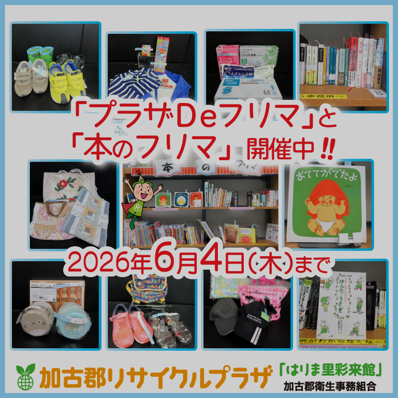 加古郡リサイクルプラザでは、商用目的ではなく、不要となったものをごみとせず、再利用による有効活用を目的とし、常設型のフリーマーケット「プラザDeフリマ・本のフリマ」を開催しています。