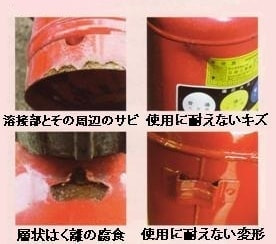外観異常のある消火器(腐食が進んでいたり、変形した物)は、破損の恐れがあり危険です。