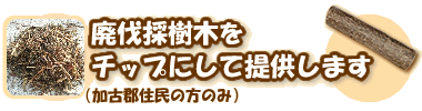 加古郡リサイクルプラザでは、加古郡住民の一般家庭から出る廃伐採樹木を受け入れています。直接、リサイクルプラザまで持ち込んでください。チップは土壌改良などに利用できます。チップが必要な人はリサイクルプラザへお問い合わせください。無料で提供いたします。