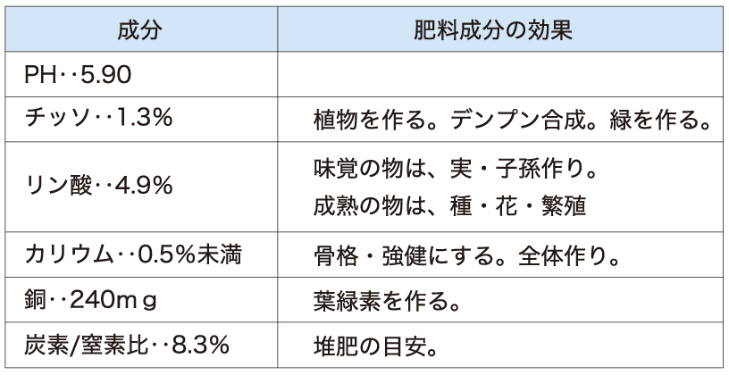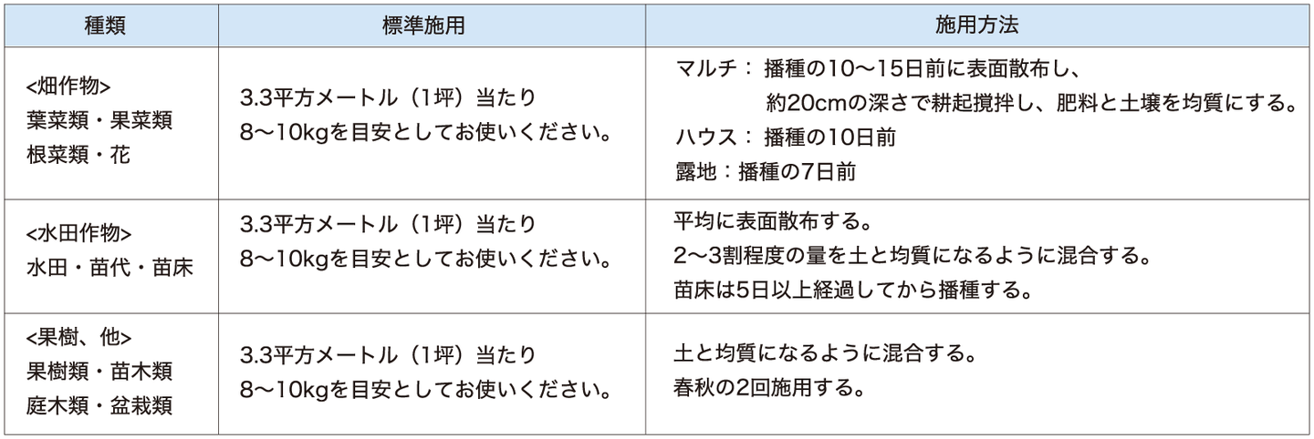 | 土壌改良(通気性・保水性・透水性・易耕性)を高め、化学肥料と比べて、微生物の働きで肥効がゆっくりと持続するので、累積的な効果があります。また臭気も少なく、取り扱いが簡単で手軽にご使用いただけるほか、病原菌や雑草種子が死滅するとされる温度(65~70℃程度)で十分に発酵させるため安全です。 |